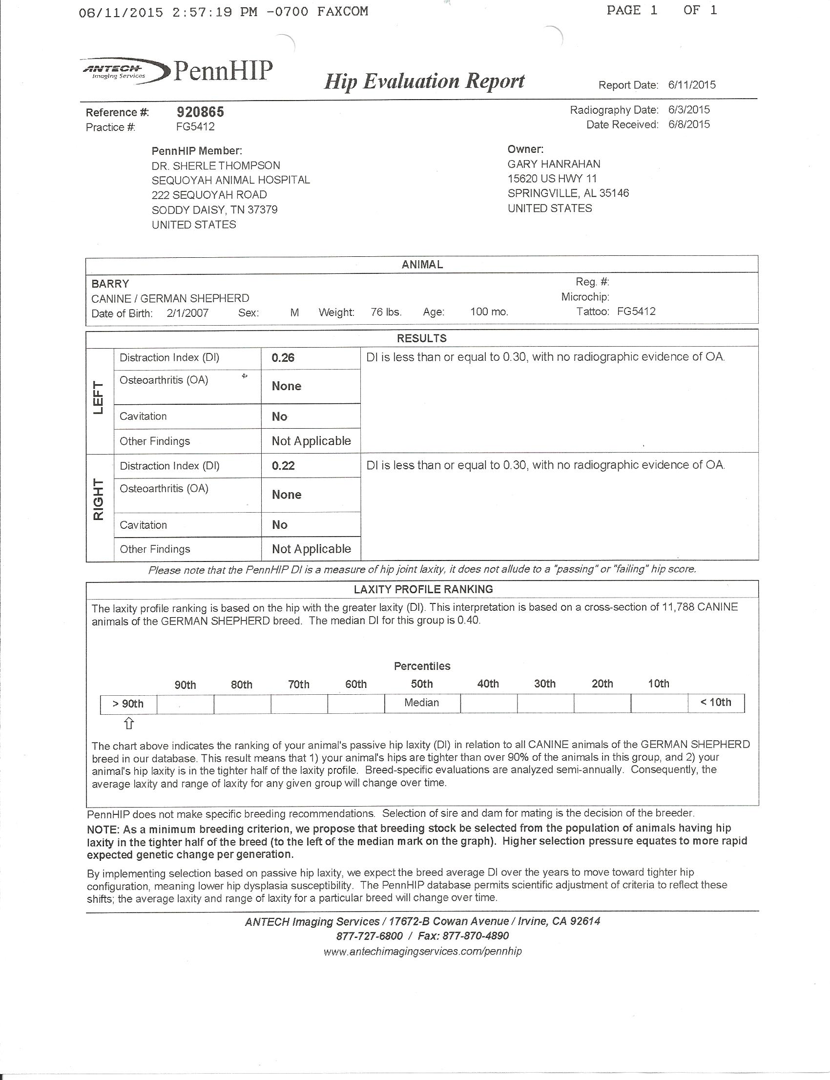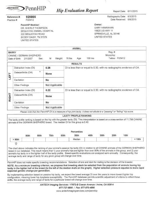 PennHip Scores: Hip Scores: Top <1% on both hips OFA Scores: Good at over 8 years of age (100 months)