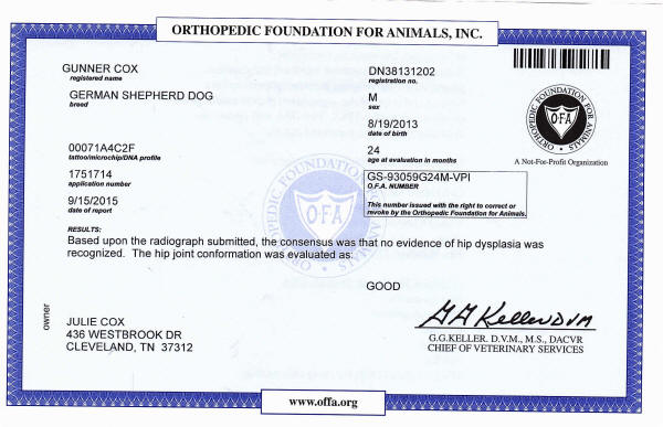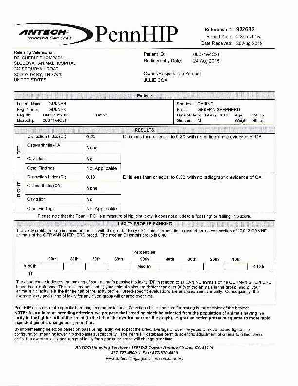 PennHip Scores: Top 1% of the breed - 0.18 and 0.24