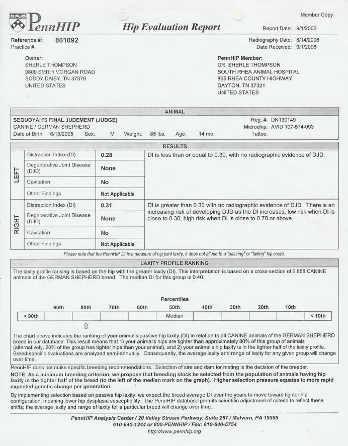 Sequoyah's Final Judgment -- Hip Scores PennHip Scores: Top 80% --