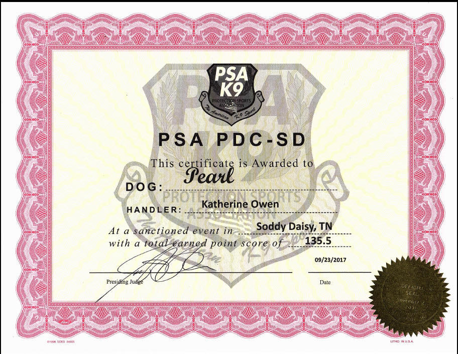 TITLES SDA Title: Family Obedience (FO) SDA Title: Protection Dog 1 (P1) SDA Title: Police Dog 1 (PD1) PSA Title on 9/23/17: PDC - SD