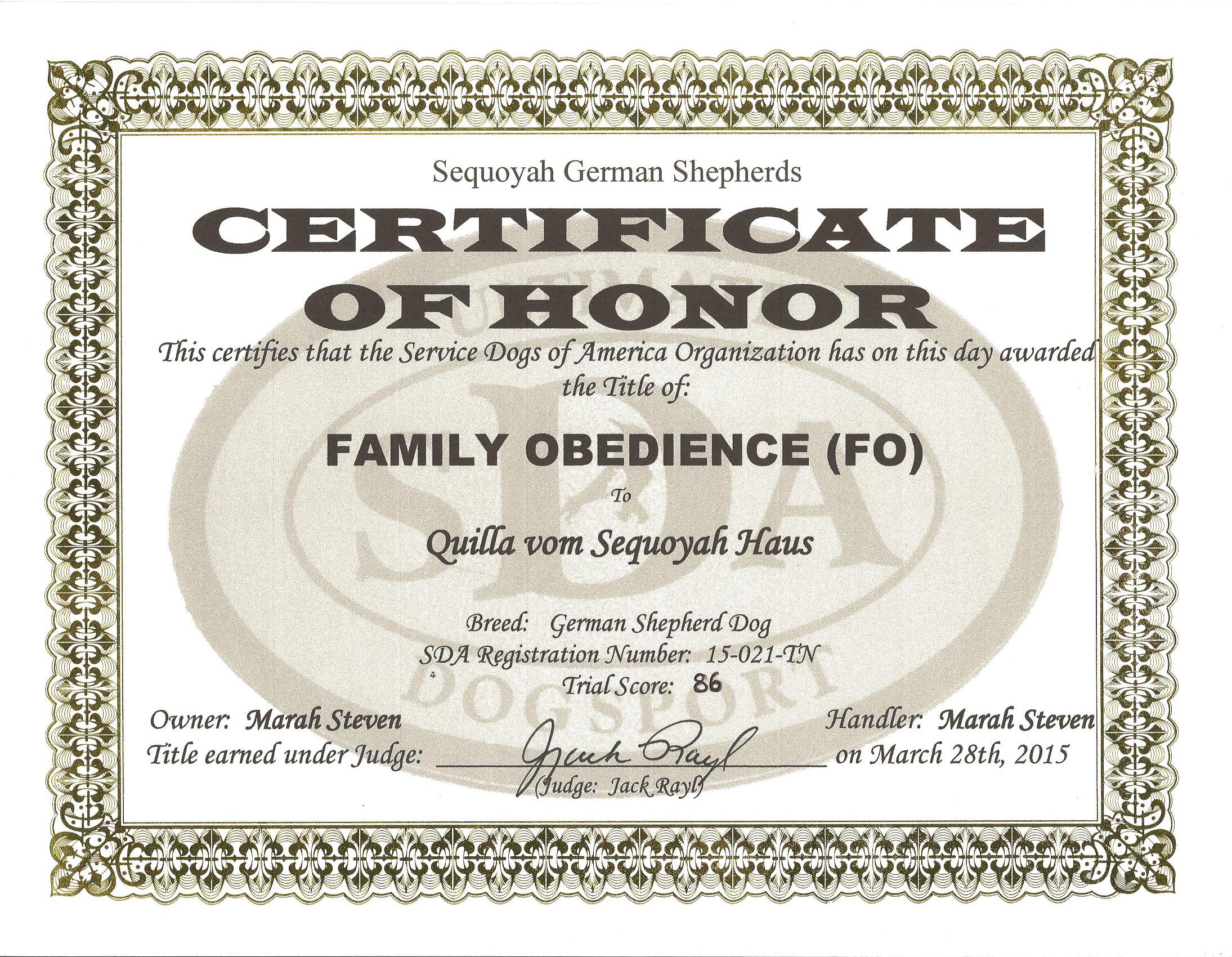 TITLES SDA Title: Family Obedience (FO) SDA Title: Protection Dog 1 (P1)