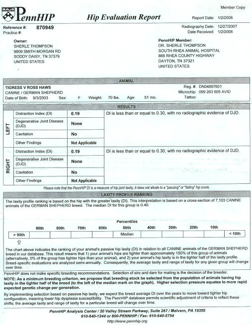 Sequoyah's Tigress v. Rosshaus -- Hip Scores OFA: Hips Good -- PennHip Scores: Top 100% at 4 years of age --